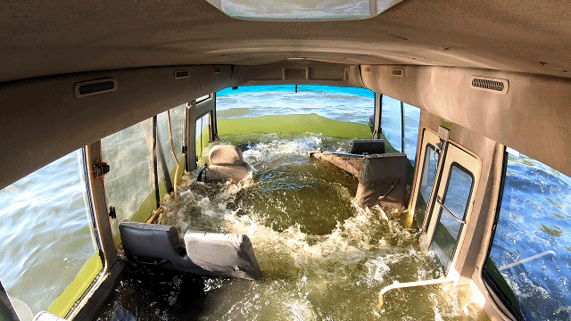 总结:车辆涉水最最重要的是——尽快离开车辆,这样才有最大的逃生机会。车子落水之初——迅速开门开窗逃离;水已经漫过车门——砸碎车窗玻璃逃生;水即将灌满车辆——憋气用力开门逃生。
