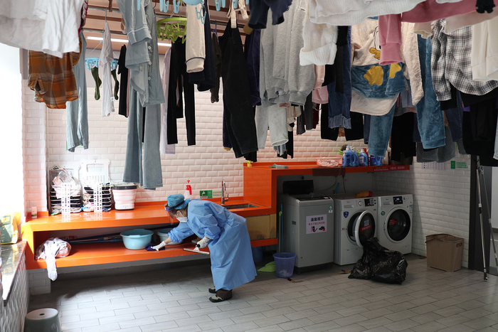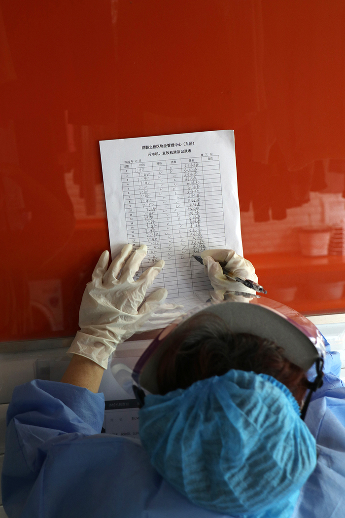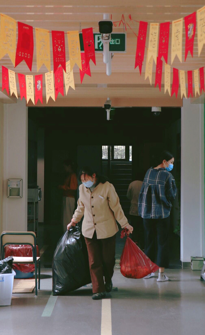 封闭时间阿姨不能回家,学校安排阿姨们住东宫。没床,阿姨们用椅子拼起了自己的床。一觉醒来腰酸背痛,但也就这样睡了三个多月。