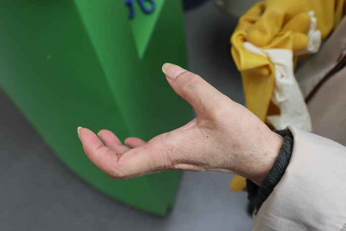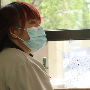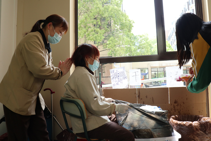照片里是老李阿姨,她比小李阿姨和小梅阿姨大几岁。是四川人。封闭化管理以后,三个阿姨每天都要提几十袋垃圾去垃圾站。不能偷懒,一偷懒湿垃圾会臭。但阿姨从来没让垃圾发臭过。