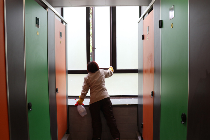 小梅阿姨很忙。在宿舍里干了二十几年卫生,她每天六点半就要来洗洗擦擦,台面上连一丝灰尘也不能有。有灰,是要扣钱的。