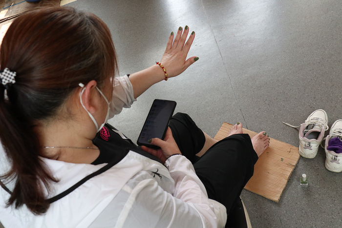 晚上的时候,小李阿姨和小梅阿姨喜欢呆在宿舍里晚一点走。流量贵,她们留下来蹭学校的WIFI给家里人打视频。