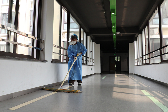 这条走廊是封闭期间同学们最喜欢呆的地方。阳光灿烂,窗明几净。小梅阿姨每天要拖两遍这个走廊,她的大拖把我拿过,很重。