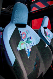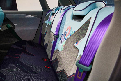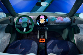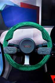 MINI以独到的方式对可持续理念进行诠释。MINI Concept Aceman内饰完全摒弃铬元素和皮革,大量采用针织面料,感性色彩与再利用材质的配合,加上柔软蓬松的触感,令车内空间更加温馨、舒适,同时不失MINI独有的精致与豪华。例如,门把手和方向盘周围深绿色的天鹅绒织物,柔软、蓬松,设计考究,让人忍不住想触摸。刺绣的细节设计层次分明,图样活泼又充满趣味。