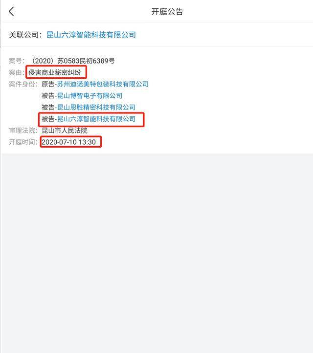 商业显示显示,2020年4月28日,一家名为苏州迪诺美特包装科技有限公司的公司以涉嫌侵犯商业秘密纠纷将三家公司告上法庭,并获得昆山市人民法院受理。
