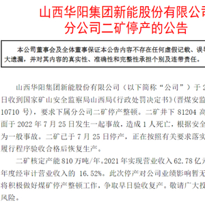 7月26日,山西华阳集团新能股份有限公司(简称:华阳股份)公告,公司于7月25日收到国家矿山安全监察局山西局《行政处罚决定书》,要求下属分公司二矿停产整顿。二矿井下81204高抽巷掘进工作面于2022年7月25日发生一起事故,造成1人死亡,根据安全事故等级划分为一般事故。二矿已于7月25日停产,正在按照有关要求落实整改措施,在履行程序验收合格后恢复生产。