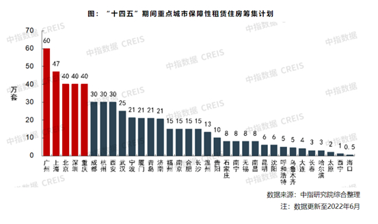 中指研究院指出,自国务院《关于加快发展保障性租赁住房的意见》印发以来,各地方政府快速跟进,截至2022年6月,全国有超80个省市出台了关于推动保租房发展的地方性文件。2022年40个重点城市计划筹集240万套(间),另有34个城市公布了“十四五”期间保租房筹集计划,共约123万套(间)。