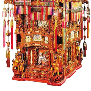 特点:金箔贴花花轿木质雕花,朱漆铺底饰以金箔贴花,轿上采用圆雕、浮雕、透雕等工艺装饰,工艺繁复、雕花精致,数百个人物和鸟兽活灵活现,是世界上现存最豪华的花轿、朱金木雕的极品,因制造时耗费了一万多个工时,又称“万工轿”。