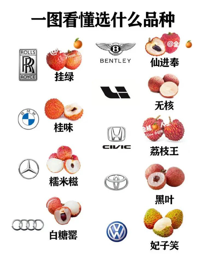 不同荔枝品种对应的汽车品牌。/小红书@金桔人生