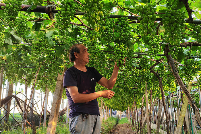 上虞区野藤葡萄园农户正在观察葡萄生长情况
