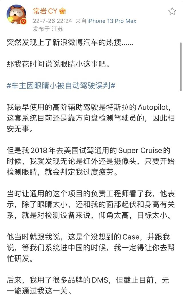 值得注意的是,智能汽车误判小眼睛人士为闭眼的情况不在少数,此前另一位汽车博主也表达过自己的类似困扰。该博主发帖称,他因为眼睛小触发过很多汽车品牌辅助驾驶系统的实时警告。通用汽车的Super Cruise会判定他过度疲劳;岚图FREE会在冬天为了让他别困打开冷风;蔚来ET7认定他开车疲劳和走神……