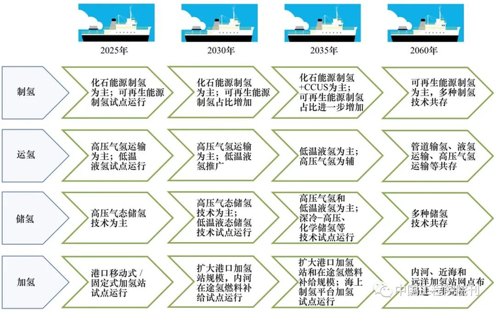 至2025年为技术积累阶段。借助燃料电池汽车技术进展,重点突破船用氢燃料电池等关键技术,制定氢动力船舶标准及规范;完成氢动力船舶装备研发,在内河 / 湖泊等场景实现氢动力船舶示范应用。
