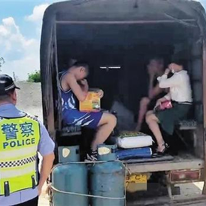 7月26日11时13分,澄迈县公安局交通管理大队在马松线15公里加58米处巡查时,发现一辆琼C5***9号牌的仓栅式低速货车后车厢内人货混载,且坐了6个人,情况十分危险。