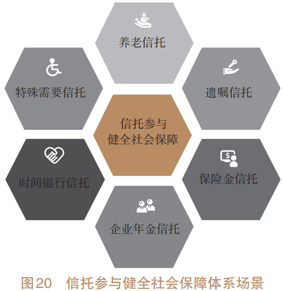 孤老残障保护与弱势群体救助对维护社会稳定、实现社会公平与正义具有积极重要作用。特殊需要信托、遗嘱信托、养老与保险金信托的创新和发展为完善残障保护、提高社会养老服务水平、满足大众对风险保障和家庭财产传承的双重需求提供可能。例如特殊需要信托可为孤老残障保护注入新的服务内容:一是可由政府设立公共受托机构,或委托专门的服务机构作为受托人,为孤老残障及其家庭提供特殊需要信托服务,弥补政府公共服务之不足,为其获得有尊严的生活创造条件。二是可由孤老残障个人设立自益型特殊需要信托,或由其家人代为设置他益型特殊需要信托,提供政府保障机制所未能涵盖的服务需求。三是可将特殊需求与保险金、遗嘱等其他信托服务相结合,例如可设计“养老监护+遗嘱+信托”等形式,以达成委托人的多种受托目的,更好地服务社会民生需求痛点和难点(见图20)。