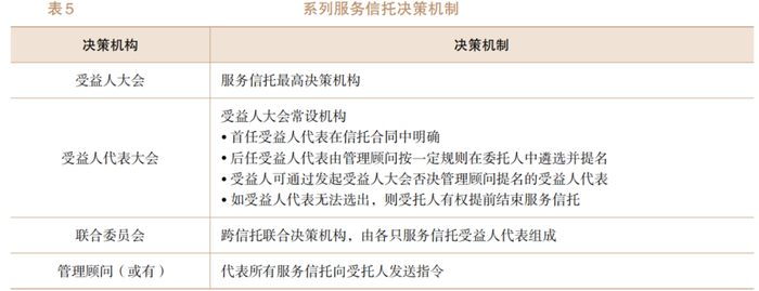 集体建设用地服务信托设想:可探索利用“集体建设用地+服务信托”方式获得租赁住房长期租赁权益,以解决周边企业职住平衡问题。村合作社以集体土地使用权出资入股项目公司,享有地块部分经营权等。信托公司为有住房需求的企业员工(投资人)设立系列服务信托。系列服务信托受让项目公司股权收益权并获得住宅部分的优先租赁权。针对系列服务信托委托人为人数众多的自然人特点,可设置受益人代表大会、联合委员会、管理顾问等决策机构,就信托财产管理问题决策并向受托人发送指令。此外,为夯实租住目的,可锁定收益权转让期限,并严格限定受让资格等。在此模式下,一方面,信托公司为委托人提供资金监管结算、信托收益权登记等服务;另一方面,信托不以获得信托收益、返还信托资金为目的;受益人通过行使优先承租权可以保障租赁权益、稳定长期租赁预期、实现家庭居有定所、提升居住幸福感的信托目的(见图18、表5)。