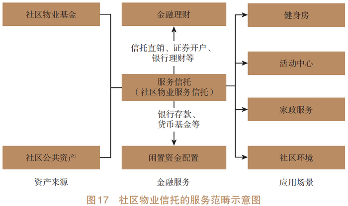 上述物业信托推广的前提是物业信托资金使用安排要保障不同业主间的利益平衡,即完备的业主大会治理机制是信托物业模式成功的关键。在实践推广中,可由信托公司联合物业公司担任受托人,或可设立专业的物业信托服务公司,更好地做到物业基金账户的监管与安全保障。此外可设置合理的投资安排,在业主委员会通过的投资范围内作好托管资金的保值与升值管理。未来,通过服务信托账户系统管理,可将社区物业费用与公共资产管理纳入信托参与的社区治理场景,通过真实可追溯的管理控制,实现社区物业基金的安全有效保管,并在社区环境维护、活动中心设施修建、家政服务提升等场景中合理规划运用。最终在“街道主导,社区协调,居民议事,企业运作”的多方联动机制作用下,实现社区物业的综合治理(见图17)。