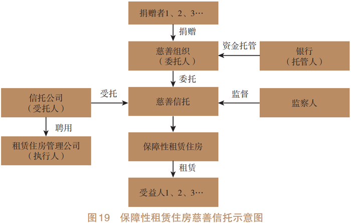 保障性租赁住房慈善信托设想:可接受委托人资金或不动产,设立慈善信托。或与家族信托结合,约定部分本金及收益用于单独设立慈善子信托,租赁或购置不动产。后续以低租金或免租金方式,向低收入和无住房困难群体提供租赁住房。信托公司、慈善组织、企业或个人、住房租赁管理公司及信托监察人等,可分别在受托管理、慈善财产募集、项目运营方面发挥专业优势,保证项目运行透明、高效、专业。但此模式对委托人自身财务要求较高,目前市场上持有强烈委托意愿建立慈善信托的慈善组织或个人仍较少。此外,保障性租赁住房慈善信托需要审慎确定受益人资质。可参考政府保障性住房申请标准,并进一步缩小受益人范围,将公益性租赁住房提供给住房困难且迫切需要的人群,做到有的放矢(见图19)。