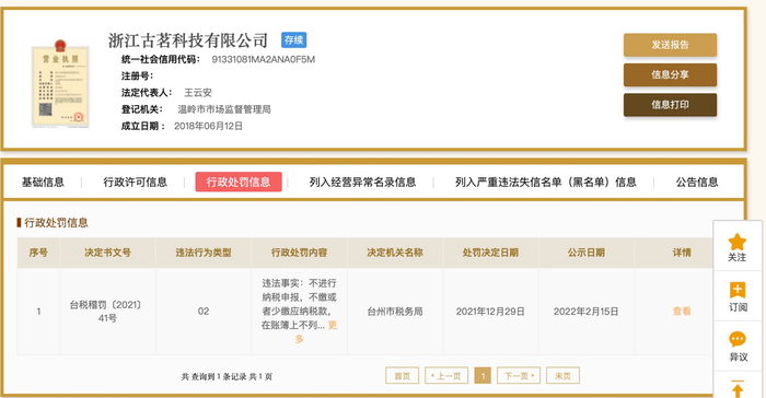 国家企业信用信息公示系统网站显示,古茗奶茶关联公司浙江古茗科技有限公司偷逃税超2322万元,被台州市税务局罚款逾1161万元。