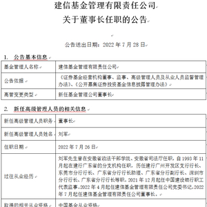 7月28日,建信基金发布关于董事长任职的公告,宣布现年56岁的公司党委书记刘军自2022年7月26日起正式任职董事长一职。