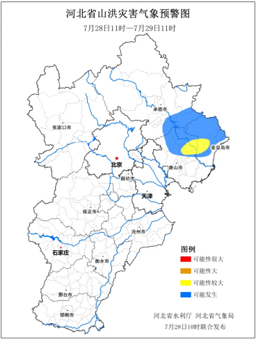 自7月28日14时至7月29日14时,我省承德市(宽城满族自治县)、唐山市(迁西县、遵化市、迁安市、丰润区、玉田县)、秦皇岛市(卢龙县、青龙满族自治县、山海关区、海港区、抚宁区)发生崩塌、滑坡、泥石流等地质灾害风险较高(黄色预警)。上述地区有关责任单位和监测人员要做好地质灾害监测、巡查、转移避险等防范工作。