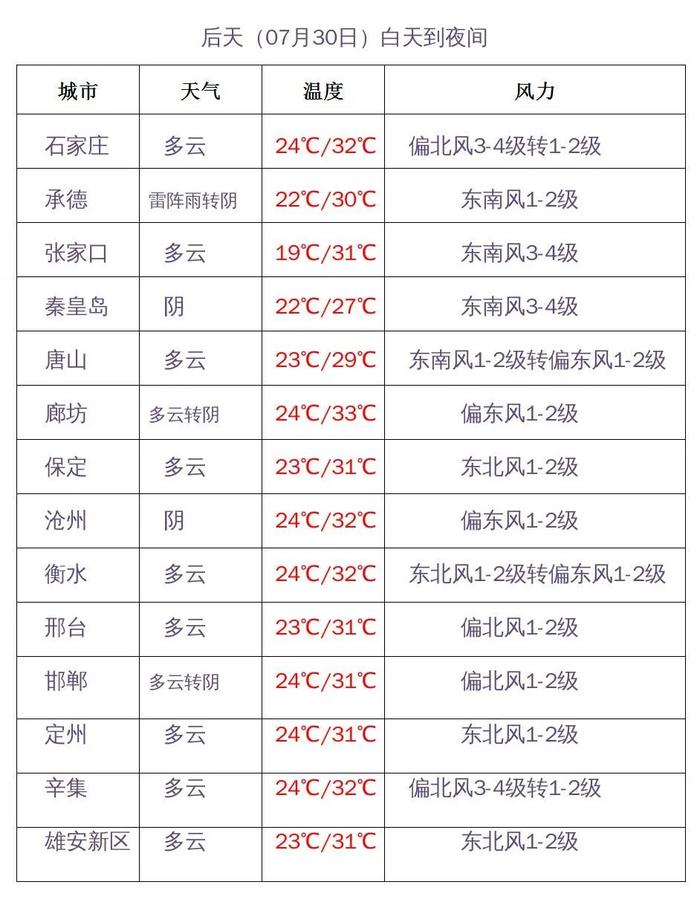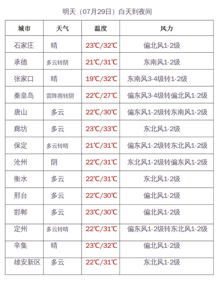 明天白天,承德南部、唐山、秦皇岛阴有雷阵雨或阵雨,张家口西部、保定西北部多云转阴有分散性雷阵雨,其他地区多云间晴。最高气温,全省大部分地区28~34℃。