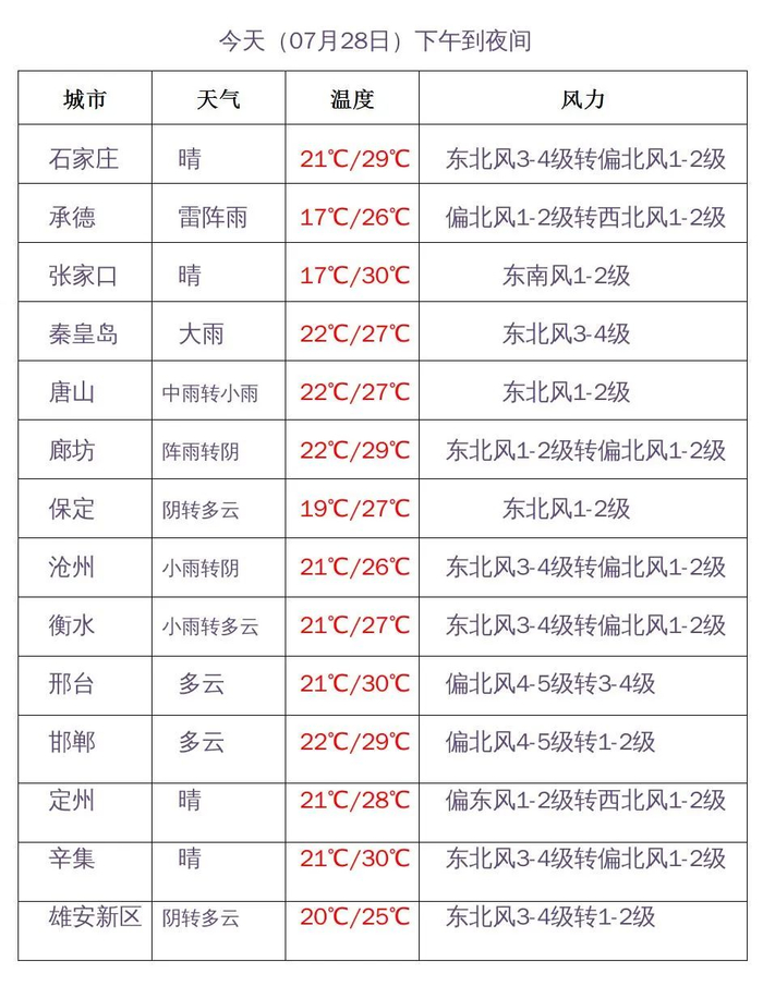 今天傍晚到夜间,承德南部、唐山、秦皇岛、沧州东部阴有雷阵雨或阵雨,其中唐山、秦皇岛局地有暴雨,个别点有大暴雨,雷雨时局地伴有短时强降水等强对流天气;其他地区晴间多云。最低气温,张家口、承德、保定西北部12~18℃,其他地区19~23℃。
