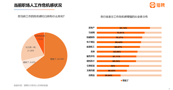 猎聘最新发布的《2022上半年中高端人才就业趋势报告》显示,超6成职场人工作危机感增强,分行业来看,房地产从业者的危机感最强,表示危机感增强的人占到该行业的82.14%。