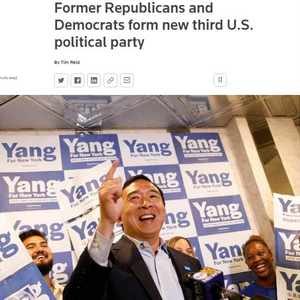 报道称,这个新政党名为“前进党”(Forward),将由前民主党籍官员、前总统参选人杨安泽(Andrew Yang)和新泽西州前共和党籍州长克里斯汀·托德·惠特曼(Christine Todd Whitman)共同担任主席。该党创始成员表示,他们希望新政党能成为主导美国政治的共和党和民主党之外的一个可行选择。