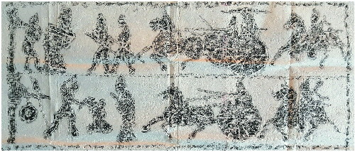 我们发掘了少数未遭盗掘的完整石椁墓,距地表两米以下,揭开盖石,骨架完好,骷髅下有铁簪,口含玉蝉,胸部放置铁剑,腰部有一堆铜钱,足部盖块黑布,石椁外一堆陶炊具,有陶罐、壶、灶、碗、仓、井、磨和猪圈。万庄村北的山坡上有一大墓,在7×6米、深6米的土圹里并列5座石椁,其中一椁略高,为男性,左右为妻妾。此墓虽遭盗扰,仍残留银、铁、铅、玉、竹、骨质文物二百余件,其中玉蝉、石砚、釉陶壶和16块画像石为珍贵文物,陶质炊具制作精美,从“大泉五十”“货泉”钱币上分析,此墓为新莽年间所建。详情已刊北京《考古》月刊,向海内外介绍。
