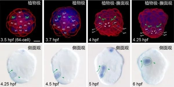 科研团队系统探究了笠贝中胚层早期发育情况。结果表明,笠贝内中胚层起源于保守的4d卵裂球,在背侧发育形成两条左右对称的中胚层带;外中胚层则起源于3a211和3b211卵裂球,在腹侧发育形成对称的中胚层组织。不同中胚层细胞群体表达不同的调控基因组合,这成为鉴定这些细胞群体的分子标签。本研究精确鉴定了外中胚层细胞的直接前体细胞,这是软体动物乃至冠轮动物中的首个报道,为比较不同冠轮动物的发育模式提供了重要支持。这些研究成果高精度地描述了笠贝胚胎中胚层不同细胞群体的起源和分化模式,为阐释软体动物的发育机制和演化历程提供了重要信息。