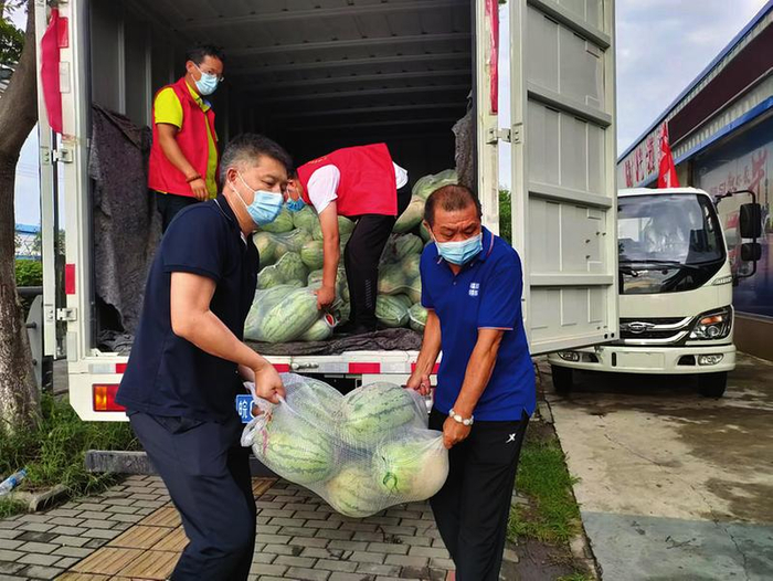 26日下午,一辆满载西瓜的货车在卡点经过消毒后进入蚌埠市区。从当天晚上开始,这批带着浓浓爱心的西瓜开始进入汽车服务行业协会各会员单位。