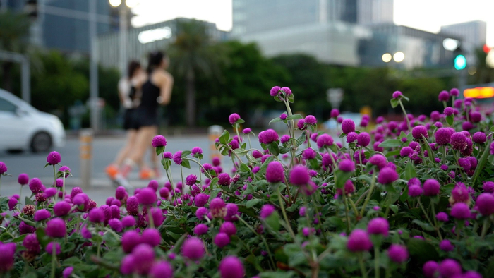 我们常见的行道花,宫粉紫荆夹道盛开、灿若云霞,簕杜鹃花开成阵、热烈似火。还有风铃木、异木棉、紫薇、六月雪、万寿菊等各类花色,粉紫色的千日红在其中只是低矮地盛放着,并不招摇,甚至经常作为其他花朵的陪衬而存在,但它星星点点汇聚而成的美丽依然能让人一见倾心,让行人们在不经意一瞥中感受到这座城市的热情和活力。