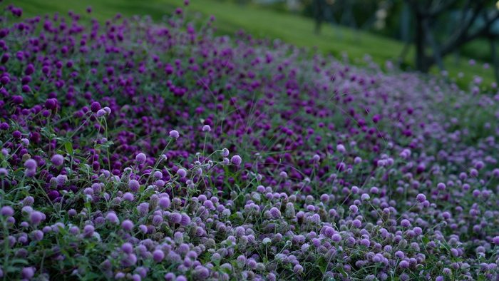 这是千日红,一种生性强健、耐高温的花,哪怕在35℃~40℃度的高温下也能生长良好,它贴地生长、野趣十足,单单看那枝头挺立的小绒圆球状花朵,算不上美丽,也绝不抢眼,但好在它株型美观大方,花繁色艳,经过密集种植和特别修剪,也能呈现出繁花似锦的效果。