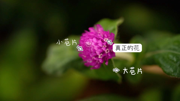 千日红真正的花朵隐藏在小苞片中间,人们平常所见的紫红、粉红、白色的可爱“花朵”实际是小苞片,真正的花埋在苞片中间,非常不显眼,不仔细寻找几乎是留意不到的。这大概就是许多热带花卉的共性,花的苞片比花朵更大更美丽,叶片像是纸质的质感,含水量很低,艳丽有光泽,花干后不会凋谢,经久不变,由此得名。