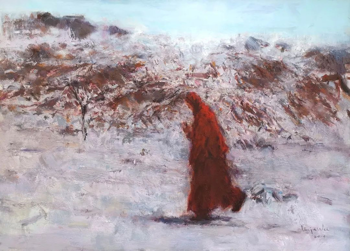 “上下求索”是东西方的成就者所共通的灵魂。油画《在路上》是艺术家刘嘉伟《西藏印象》系列作品中比较独特的一幅。苍茫的山野天地之间,一位红衣的求道者在风雪中踽踽独行。
