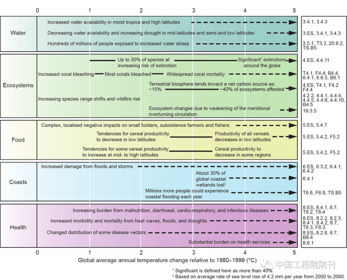 值得关注的是,TAR引入了5个“关切理由”(reasonsfor concern),“概念性”地表达了重视气候变化风险的原因(图1)包括:独特和濒危系统的风险、极端天气气候事件风险、影响的分布、综合影响,以及未来大规模突发事件的风险。该图用全球年平均温度代表气候变化的强度,但特别指出未来的影响将是全球和区域平均气候变化强度、速度、气候变率和极端气候现象、社会和经济状况以及适应性的函数,其取决于多个方面。报告认为,设定避免“气候系统受到危险的人为干扰”水平的战略、目标和时间表时,需要考虑气候、生态和社会经济系统存在的惯性和不确定性,从更为综合和直观的角度,评估气候变化可能带来的风险,并且将其与全球平均温度相联系。如图1所示,虽然TAR没有明确提出什么样的温升应该成为“气候系统受到危险的人为干扰”的指标,但显示4°C以上的温升将带来极大的风险。这5个“关切理由”在IPCC的后续评估中被不断使用。