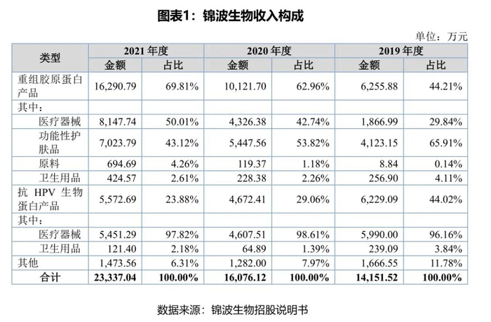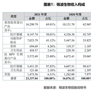 锦波生物当前的主要产品为“重组胶原蛋白产品”、“抗HPV生物蛋白产品”,2021年营收占比分别为69.81%、23.88%,其中重组胶原蛋白为主力产品,主要应用于皮肤科、妇科等领域。不管是“重组胶原蛋白产品”还是“抗HPV生物蛋白产品”,皆以医疗器械产品为主,与制药基本不相关。
