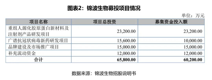 锦波生物在2020年6月申报科创板上市时,便已将新冠药物研发作为主要募投项目之一,两年后(2022年6月)申报北交所上市继续将该项目作为主要募投项目之一。招股书显示,锦波生物本次申报北交所上市拟募集6.02亿元,其中1亿元用于“广谱抗冠状病毒新药研发项目”,项目总投资额1.56亿元。