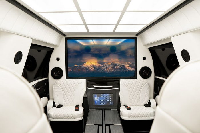 装甲版凯迪拉克凯雷德“Chairman”车身轴距达3406mm,并配备大尺寸多辐式熏黑轮圈与防弹轮胎。车尾部分,两侧纵置LED尾灯组点亮后辨识度较强,双边共双出矩形排气系统结合宽大的后包围组件极具气势。值得一提的是,该车在尾门内侧带有装甲护板并配备防弹玻璃为用户提供全方位的保护。