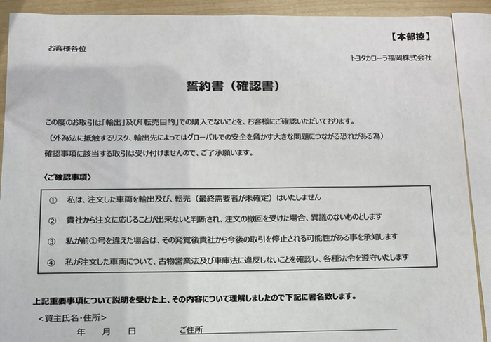2022年,丰田的新款Land Rover在日本发售之后,购车者收到的合同中还包含这样一份承诺书附件。