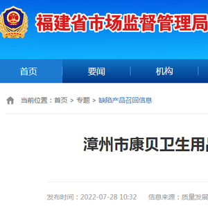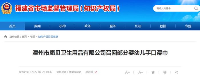 【福建】漳州市康贝卫生用品有限公司召回部分婴幼儿手口湿巾
