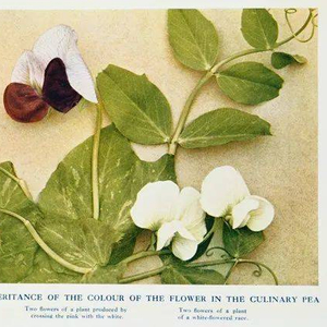 孟德尔发现豌豆花的颜色可以遗传。中间的花是粉色花和白色花杂交的后代。来源:Oxford Science Archive/Print Collector/Getty