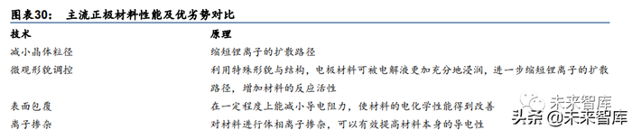 目前已有众多工艺路线攻克磷酸锰铁锂电导率较低的问题,未来其应用范围有望实现大幅 拓宽。由于磷酸锰铁锂材料电导率较低,阻碍了其进一步的大规模应用。目前已有许多新 的工艺合成路线,能够有效解决磷酸锰铁锂电导率较低的问题。通过采用减小颗粒尺寸、 导电物质包覆、体相离子掺杂、材料结构设计与形貌调控等单一措施或者利用多种措施的 协同作用能够对 LFMP 进行有效的性能改良。随着技术的持续发展,未来其应用范围有望 实现大幅拓宽。