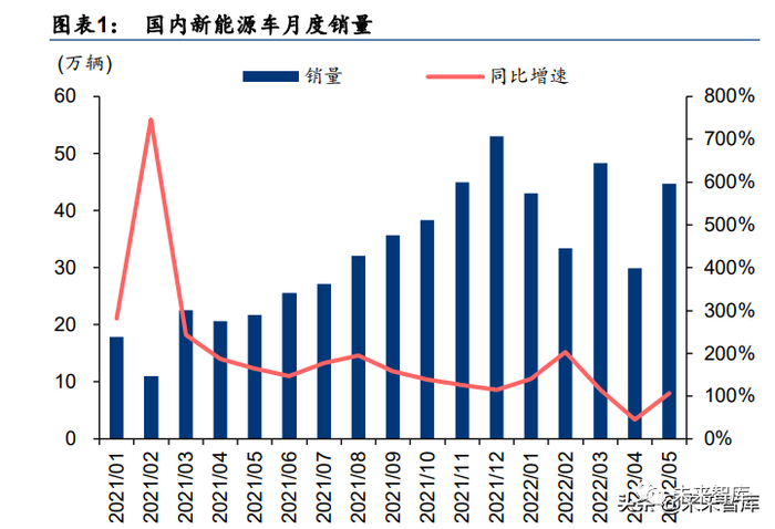 国内 5 月份新能源车销量超预期。据中汽协数据,5 月国内汽车销量 186.2 万辆,环比增长 57.6%,同比下降 12.6%。其中,5 月新能源汽车销量 44.7 万辆,环比增长 49.6%,同比 增长105.2%。5月新能源车渗透率达 24.0%,21年 5月渗透率为 10.2%,同比增长 13.8pct。5 月新能车销量超预期,一方面系疫情影响缓解,产业链复工复产稳步推进,另一方面有竞 争力的新能源车型下游需求旺盛。