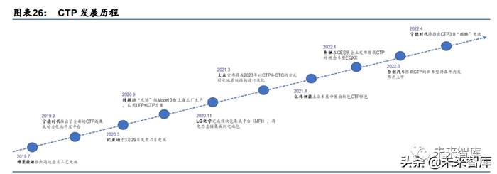 CTP 与 CTC 有助提升能量密度、降本。CTP 技术是将电芯直接成组为 Pack,相较于 MTP 省去了中间模组环节,省去组装为传统模组这一步骤,本质是为了提高能量密度和降本。CTC 在 CTP 基础上进一步提升集成化程度,提高能量密度。CTP/CTC 一方面提升了空间 利用效率,提升带电量;另一方面,简化结构,减少零部件数量,有助于提升生产效率, 降低成本。