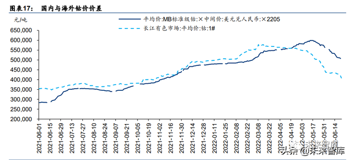 22Q2 碳酸锂库存收益减弱,部分出口订单多的企业受益于钴国内外价格倒挂。4 月份以来, 碳酸锂价格冲高后高位企稳,根据 Wind,碳酸锂价格由 3 月底超 50 万元/吨,逐渐下降至 6 月上旬的 46.75 万元/吨,22Q2 均价 47.14 万元/吨,相较于 Q1 均价 42.20 万元/吨仍然 处于高位。但根据鑫椤锂电,正极材料价格 4 月末以来已环比小幅下降。我们预计由于低 价库存已在 Q1 逐渐消耗,Q2 正极环节库存收益环比减少。对于出口较多的当升科技,公 司采购原材料按照国内报价,销售商品按照海外 MB 钴报价,由于 Q2 国内钴价格和海外 MB 钴价格倒挂,根据 Wind,4 月下旬以来国内外钴价反转,两者价差最高达到 11.8 万元 /吨,因而公司有望受益于价差。