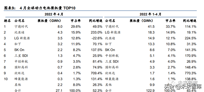 4 月全球动力电池装机量多数保持稳定增长,中国企业优势明显。据 SNE Research,4 月 全球电动车电池装机量达到 27.1GWh,同比+52.3%,连续第 22 个月保持稳定增长,1-4 月累计出货量 122.9 GWh,同比+83.4%。装机量排名前十的企业中,中国企业占到了 6 家, 市占率达到 54.6%,6 家同比增长全部超 49%,除宁德时代外远高于市场平均增速;而前 十名中的日韩企业增速明显相对缓慢,市占率有所下滑。比亚迪4月装机量反超LG新能源, 达到4.3GWh,同比+233.0%。宁德时代 4月装机量 8.0GWh,同比+49.5%,市占率达 29.6%, 继续领跑全行业。欣旺达 4 月装机量超过蜂巢能源跻身前十,达到 0.4GWh,同比+709.4%, 市占率达 1.7%。结合目前趋势和国内电池厂商扩产推进情况看,22 年中国企业的装机量和 市占率有望继续增长。