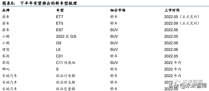 爆款新车型是需求核心驱动因素,下半年仍有新车型期待。根据各公司官网和公告,今年 以来,造车新势力和自主品牌纷纷推出智能电动化新车型。22 年下半年,即将上市的新能 源车层出不穷。造车新势力中,较受关注的理想 L9 公司 8 月交付;小鹏 G9 同样是属于旗 舰车型,定位是纯电中大型 SUV,将于 Q3 开始交付;蔚来搭载 NT2.0 平台的 ES7 预计 8 月下旬实现量产交付,ET5 也将于 9 月交付;5 月零跑推出了搭载首款可变架构油冷电驱 总成的全新零跑 C01,年内还将正式交付 C11 四驱性能版车型;哪吒于 6 月开启了新车型 哪吒 S 耀世版预售。其他自主品牌中,极氪计划在年内推出一款纯电动 MPV 车型;由长 安、华为、宁德时代共同打造的阿维塔 11 已经开启预订,将于年内量产;吉利旗下的高端 纯电品牌几何于 5 月开启 SUV 车型几何 E 的预售。这些新车型在快充体验、智能化体验上 有进一步提升,或将是刺激 22 年国内需求高增的核心驱动因素。