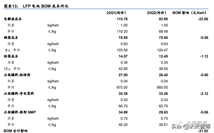 Q2 部分原材料的价格有所回落,对盈利能力有提振。从原材料成本看,Q2 部分材料的价 格相对于 Q1 有所松动。虽然正极材料因碳酸锂价格高企维持涨势,但是其他大部分材料价 格都相对 Q1 下滑。四大材料中电解液成本降低最为显著,主要系六氟磷酸锂、VC 等上游 材料的价格下降带动,测算得 LFP 电池单位 kwh 电解液成本节省 22.86 元,三元 NCM523/NCM811 单位 kwh 电解液成本节省 17.44 元/18.33 元。PVDF、NMP 和碳纳米管 (导电浆料)的价格也有所下滑。综合来看,考虑成本联动传导机制的落地,以及逐渐趋 于理性的原材料价格,我们认为产业链 Q2 的盈利能力有望得到提振。