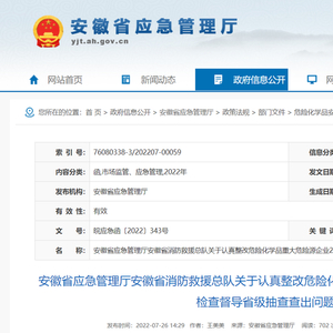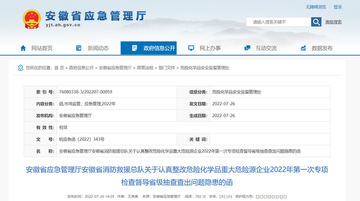 7月26日,安徽省应急管理厅在官网公布了安徽省应急管理厅安徽省消防救援总队关于认真整改危险化学品重大危险源企业2022年第一次专项检查督导省级抽查查出问题隐患的函,披露了18家企业近170项隐患问题,并提出各级相关部门要高度重视,扎实推进企业落实隐患问题整改,及时组织开展整改验收。同时,对检查发现的违法违规行为严格依法处理,做到隐患整改和安全执法双闭环管理。原则上8月15日前所有问题隐患要全部完成整改。