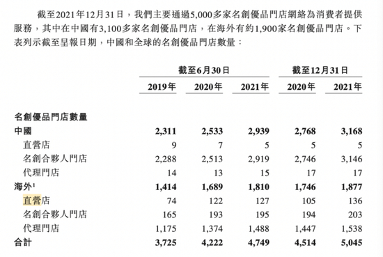 名创优品赴港上市时的招股书显示,截至2021年年底,名创优品在全球的门店数目累计达5045家。其中,国内门店3168家,直营店5家;海外门店1877家,直营店136家。名创优品美股财报中进一步显示,截至今年一季度末,名创优品在中国合计拥有直营店11家。